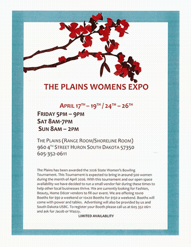 The Plains has been awarded the State Women's Bowling Tournament. This tournament is expected to bring in around 500 women during the month of April. We have decided to run a small vendor fair during these times to help local businesses thrive! We are currently looking for fashion, beauty, home decor and etc. vendors to fill our event. We are offering a 10x10 booth for $$90.00 & 10x20 booth for $150.00. Booths will come with power and tables. Advertising will also be provided by The Plains and South Dakota USBC. TO register your Booth please call the plains at 605-352-0611 and ask for Jacob or Wazzy.